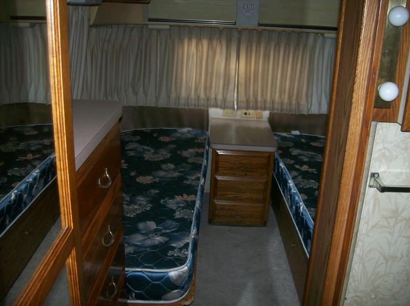 Great tires, original cast aluminum wheels, big aluminum LP tanks, great body, beautiful interior, on demand hot water heater, outside shower, center bath, rear twins, big fridge, great awning, flag mount, electric heat and auxillary electric heat, portable ice maker, beautiful new curtains and all new upholstry.